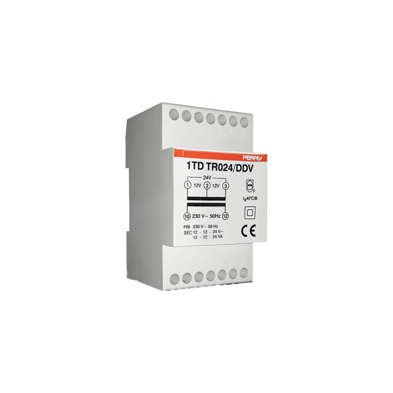 Transformateur 24 VA pour fonctionnement continu, sorties 12-12-24 V - 3 DIN - CARACTÉRISTIQUES TECHNIQUES Alimentation : 230 V ac – 50 Hz Sorties : 12-12-24 V Installation : à l’arrière du tableau électrique Indice de protection : IP 40 Dimensions : 52,5 x 60 x 128 mm