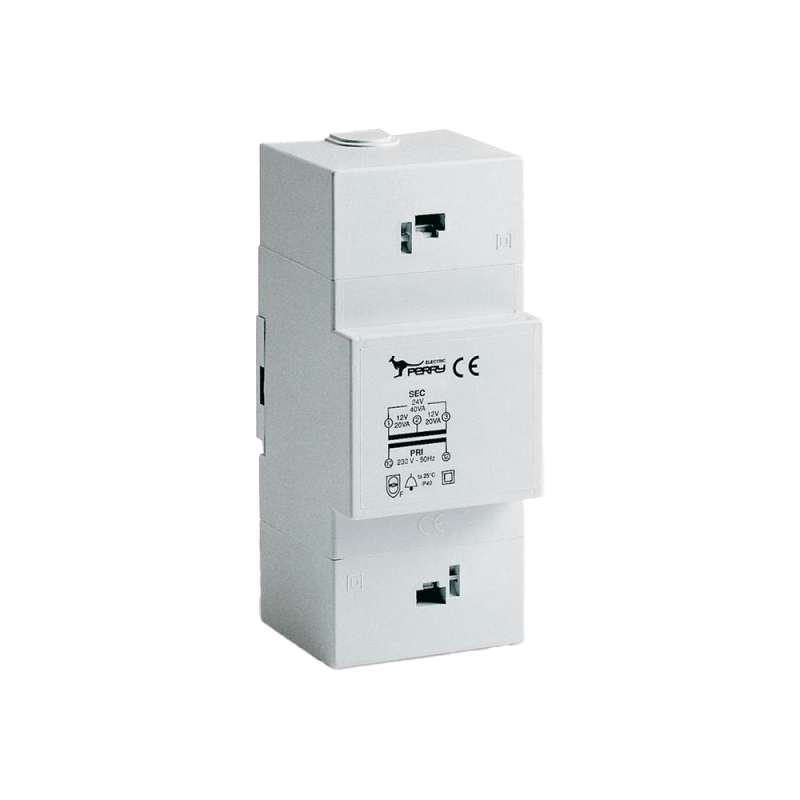 Transformateur 40 VA pour usage intermittent, sorties 12-12-24 V, montage mural. CARACTÉRISTIQUES TECHNIQUES : Alimentation : 230 V ac – 50 Hz ; Sorties : 12-12-24 V ; Montage mural : IP 30 ; Installation à l’arrière du tableau électrique : IP 40 ; Dimensions : 52,5 x 60 x 128 mm