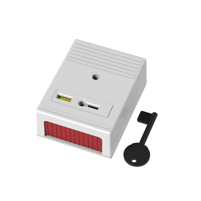 Bouton panique à point unique. Réinitialisation par clé. Bornier à 5 vis. Fabriqué en acier inoxydable. Sortie contact NO/NF. Témoin d'activation. Norme EN50131 Grade 1, Classe environnementale II