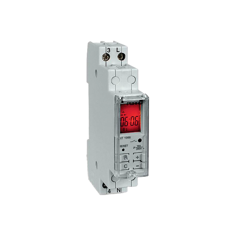 Minuterie avec écran LCD multifonction pour un réglage simple et précis. CARACTÉRISTIQUES TECHNIQUES : Alimentation : 230 V ac 50/60 Hz ; 1 sortie contact NO polarisé : 16(3) A / 250 V CA ; Puissance : - Lampes à incandescence jusqu’à 2 300 W - Lampes fluorescentes jusqu’à 290 W - Lampes fluorescentes électroniques jusqu’à 105 W ; Minuterie réglable de 1 seconde à 99 minutes par incréments de 59 secondes. Réinitialisable ; Fonction de nettoyage des escaliers : 30 min (réglable de 1 min à 99 min) ; Arrêt par simple pression de 15 secondes à 300 secondes ; Jusqu’à 35 boutons lumineux ; Indice de protection IP40 ; Relais fixe ; Compteur horaire pour le remplacement de la lampe. Affichage de l'état d'entrée (ouvert/fermé) ; affichage de l'heure à l'écran ; indicateurs d'échelle de temps : HMS ; connexion à 3 ou 4 fils ; câbles de 1 mm² à 2,5 mm² ; dimensions : 17,5 x 60 x 90 mm