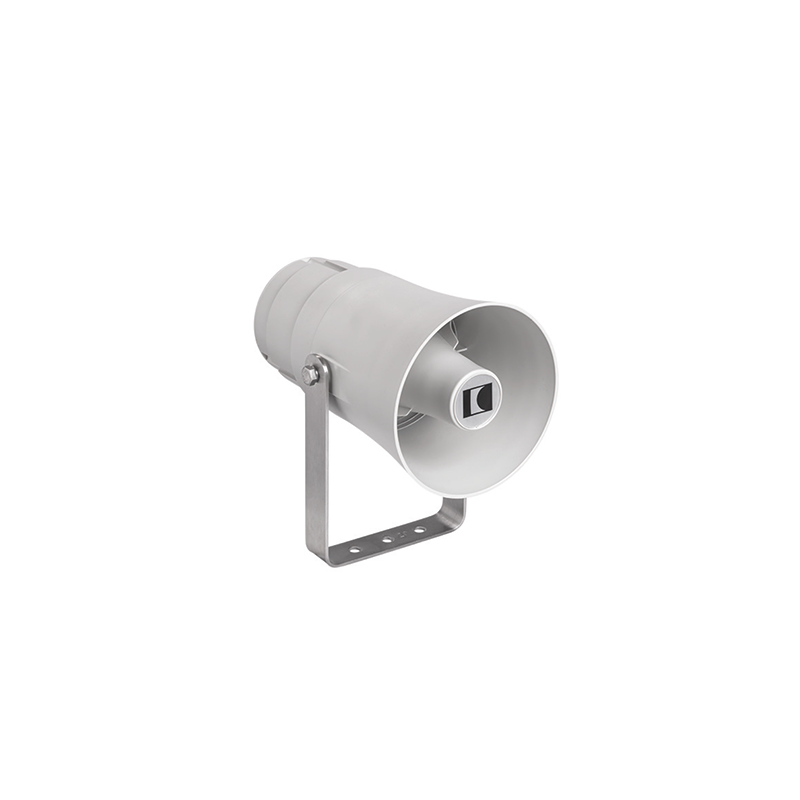 Haut-parleur exponentiel pour alarme vocale Puissance nominale : 10 W à 100 V. Niveau de pression acoustique : 106,7 dB Certifié EN4 pt14. Usage extérieur (type B). Indice de protection : IP66. 4 niveaux de puissance (10/5/2,5/1,25 W). Fixation murale ou au plafond. Matériau : ABS. Connecteur céramique 3 broches. Dimensions : 142 × 256 mm. Blanc RAL 7035.
