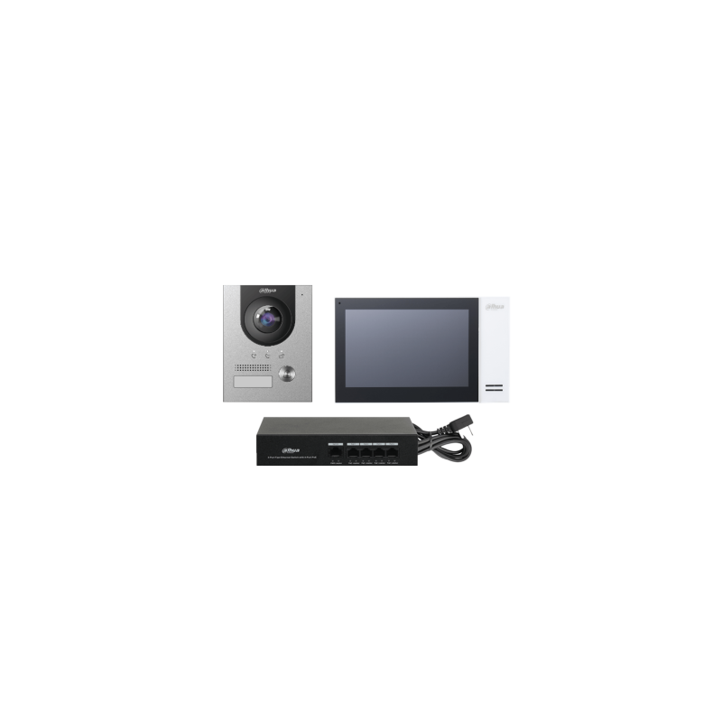 Panneau de contrôle IP (DHI-VTO2201F-P) : Façade en aluminium anodisé, capteur CMOS HD 2 MP / caméra 140° 2 MP, interphone vidéo, contrôle d’accès : compatible avec deux serrures, application compatible pour la commande vocale et l’ouverture de porte, montage en surface, compatible PoE, indice de protection IK07 et IP65. Moniteur IP intérieur (DHI-VTH2421FW-P) : Écran tactile TFT 7", entrées/sorties d’alarme : 6 entrées / 1 sortie, compatible PoE, alarme SOS . Commutateur (DH-PFS3005-4ET-36E) : Ports 1 à 4 : 4 × RJ-45 10/100 Mbits/s (PoE), port 5 : 1 × RJ-45 10/100 Mbits/s (liaison montante).