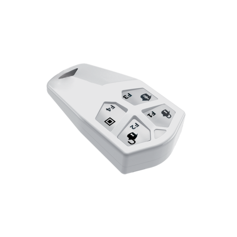 Télécommande radiocommandée. 4 boutons programmables. Témoin LED d'état du signal (armé/désarmé). Verrouillage/déverrouillage des boutons. Pile CR2032. Couleur : Blanc.