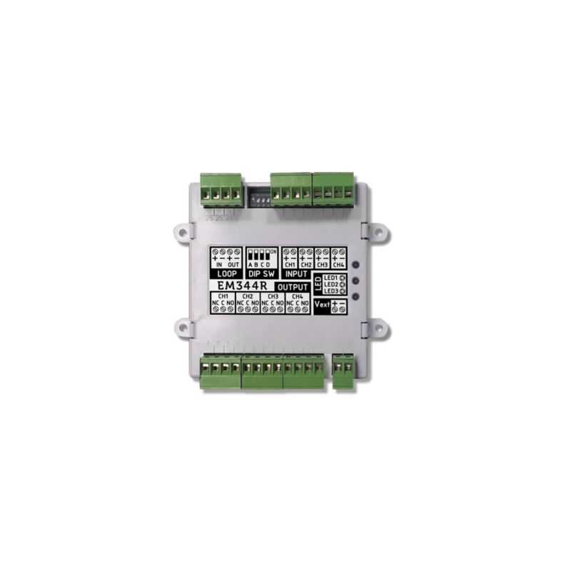 Module analogique adressable avec 4 entrées supervisées (dont 2 configurables en entrée, entrée ligne conventionnelle ou 4 x 20 mA) et 4 sorties relais. Occupe 4 adresses dans le circuit ENEA. Boucle d'isolation CPR intégrée. Certifié EN54pt17/pT18.