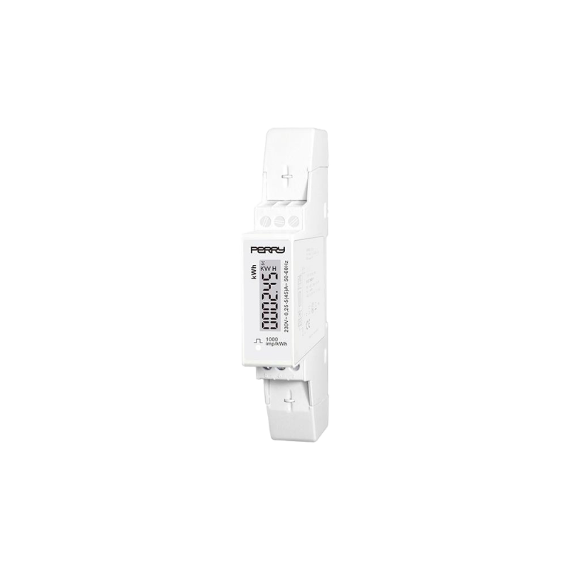 Compteur d'énergie numérique monophasé - 1 DIN. Régule la consommation d'énergie active dans les systèmes monophasés 230 V CA, jusqu'à un courant maximal de 45 A en connexion directe, avec sortie impulsionnelle : transistor à collecteur ouvert 5-27 V cc , 27 mA CC max. CARACTÉRISTIQUES TECHNIQUES : Alimentation : 230 V CA ±10 % 50-60 Hz. Affichage : 5 chiffres + 1 décimale. Résolution : 0,1 kWh. Courant d'entrée : 45 A max. Courant/puissance minimum mesurable : 20 mA/4,5 W. Classe de précision : IEC 62053-21, classe B EN 50470-3. Dimensions : 17,5 mm × 62 mm × 119 mm