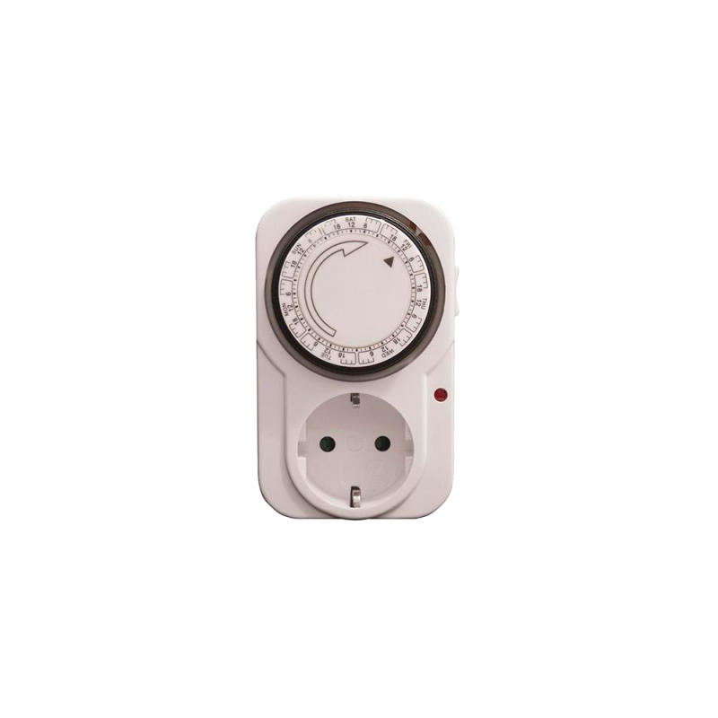 Minuterie hebdomadaire, prise Schuko 16 A. CARACTÉRISTIQUES TECHNIQUES Alimentation : 230 V ac 50/60 Hz Contacts : 16 A Puissance de commutation maximale : 3 500 VA Intervalle d’intervention minimal : 120 min Commande : MARCHE / MINUTERIE