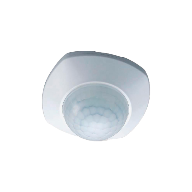 Détecteur de présence infrarouge semi-encastré au plafond avec détection de passage par zéro – IP 20 SPÉCIFICATIONS TECHNIQUES Montage au plafond Alimentation : 230 V ac 50 Hz Puissance lumineuse maximale : - Lampes à incandescence : 2 000 W - Lampes fluorescentes (non compensées) : 480 W - Lampes fluorescentes (contreplaqué parallèle) : 250 W - Lampes fluocompactes/LED (230 V) : 7 W - 23 W max. Indice de protection : IP 20 Niveau de pollution normal Angle de détection : 360° Distance de détection maximale Réglage du délai de désactivation : 5 s - 12 min Réglage de l’éclairement : 30 à 200 lux Classe d’isolation : II Récepteur infrarouge pour télécommande Marquage CE Norme de référence : LVD/EMC EN60669-2-1 Dimensions : Ø 97 x 85 mm
